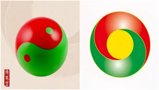 老子说“曲则金”,德是“一”,这个“一”只要弯曲起来就构成一个“○”态,然后中间又有一个 S 型太极波纹,就非常完美,很自然地构成了太极的“二”。