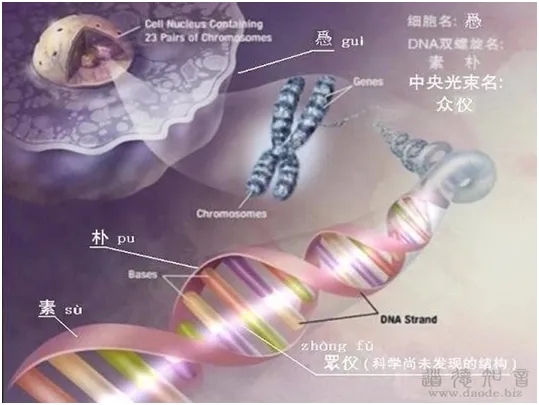 古人在修身内证当中,在生物光的作用下,同样发现了双螺旋结构,老子就曾经分别用“朴”与“素”来表述双螺旋结构,只是跟西方现代的命名不同而已。