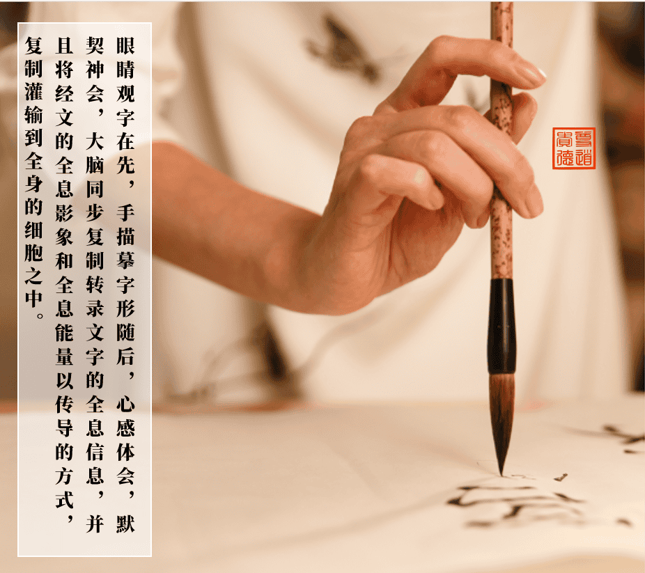 抄写经典过程中的得“心”应“手”和“心灵手巧”的实现,需要眼睛观字在先,手描摹字形随后,心感体会,默契神会,大脑同步复制转录文字的全息信息,并且将经文的全息影象和全息能量以传导的方式,复制灌输到全身的细胞之中。